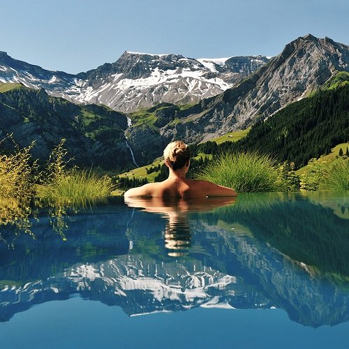 7. Európában is vannak csodás medencék. Ez például a svájci Alpokban, egy wellness hotelben található, ahol a felfrissülés, a relaxáció az elsődleges a vendégek számára.