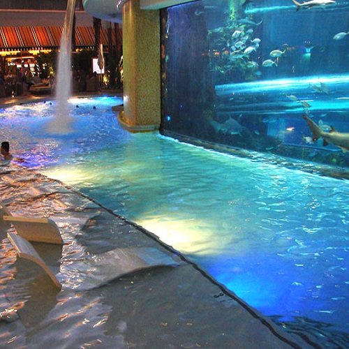 6. Las Vegas a fények városa, de azért a medencék közül is itt található az egyik különleges darab. Három élménycsúszda, középen pedig egy cápákkal teli tartály található, valamint egy bár, ahol eltölthetik a “fáradt” játékosok az idejüket.