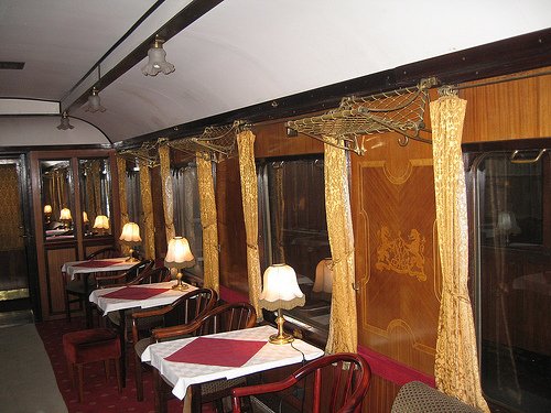 Az étkezőkocsi gyönyörű múlt századbeli kialakítású.